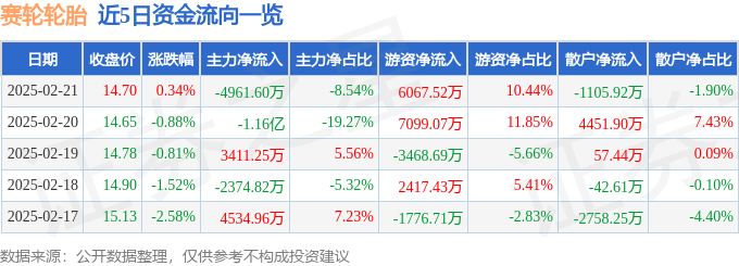- 证券之星消息,截至2025年2月21日收盘,赛轮轮胎(601058)报收于14...