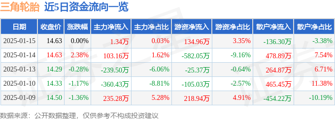 - 证券之星消息,截至2025年1月15日收盘,三角轮胎(601163)报收于14...