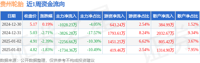 - 证券之星消息,截至2025年1月3日收盘,贵州轮胎(000589)报收于4.8...