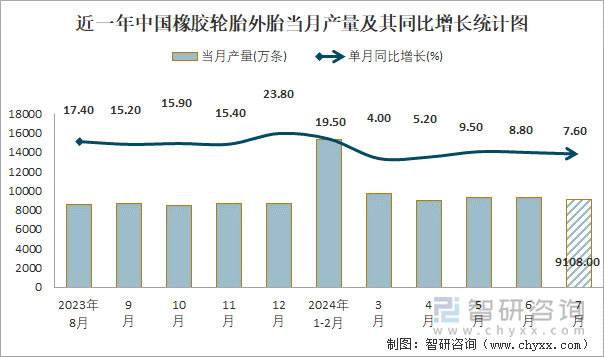 - 2024年1-7月中国橡胶轮胎外胎产量为615682万条累计增长103%