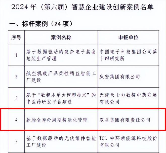 - 双星成为轮胎行业唯一获评2024年智慧企业建设创新案例
