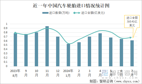 - 根据中国海关数据显示:2024年7月中国汽车轮胎进口数量为0.61万吨,同比下...