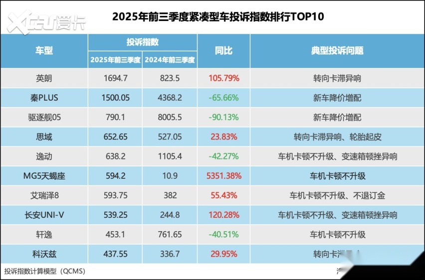 - 2025年前三季度紧凑型车投诉指数排行:车机引集体投诉